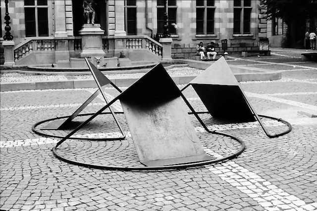 “The installation is in a relationship with its environment. It renders an image of the city at its origins. An intimacy, a dialogue is established between the three elements. One can enter the piece of art. Man is placed central between the three constructions which have been placed correctly while influencing and complementing one another. The image of shadow introduces time: the metal plates which have been placed in a sloping way register the Sun’s orbit in their own manner.”
